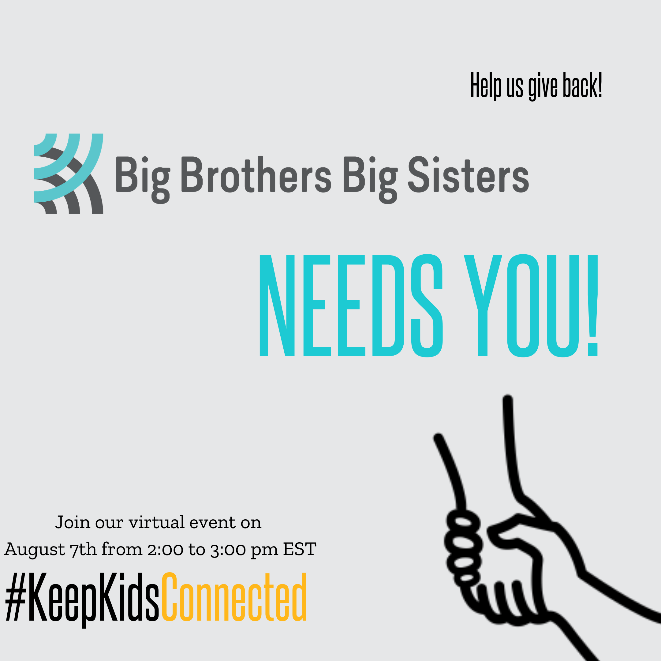 TEXT SAMPLE 1: Big Brothers Big Sisters is working to #KeepKidsConnected and to connect families with vital resources during this crisis. As a supporter, I’ve seen first-hand the impact of one-to-one mentorship—and that’s why I’ve committed to watching their live Keeping Kids Connected event on August 7 from 2PM -3PM EST and I’d for you to be there. Join the event at https://www.facebook.com/events/665682024036206/